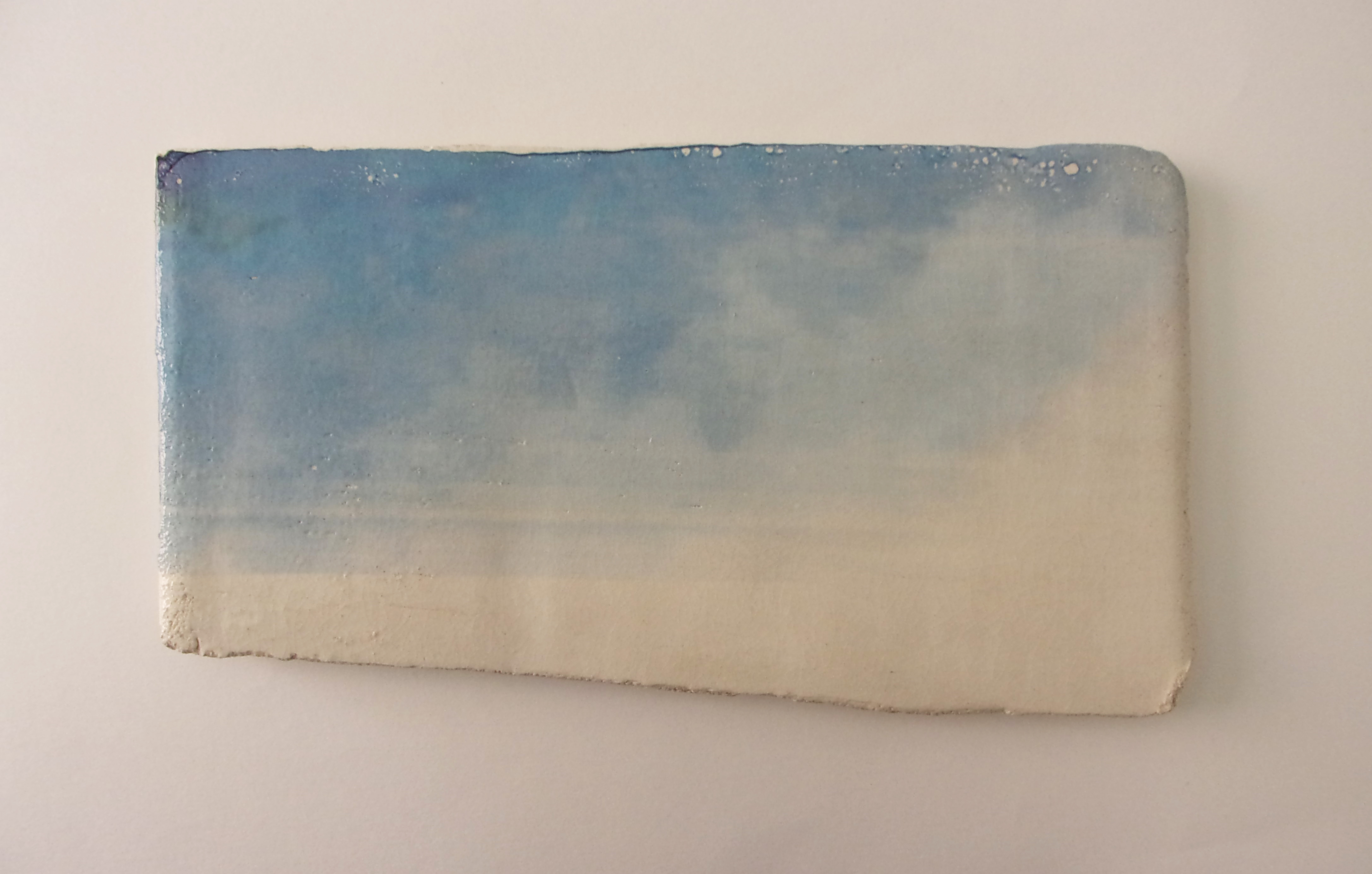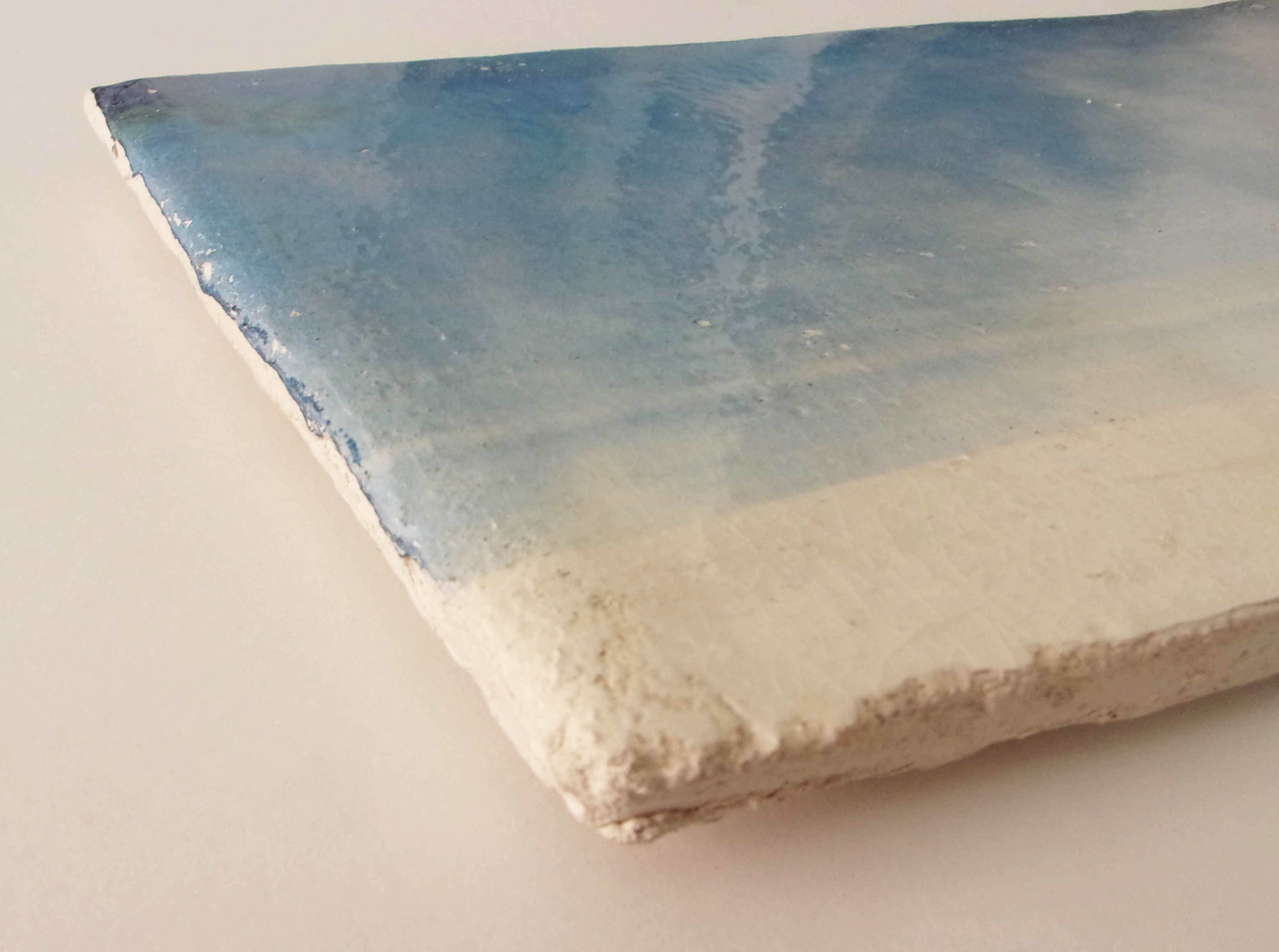 Impression chromos d’une photographie basse résolution d’un mur en crépis sur un volume en céramique (30x15cm) .