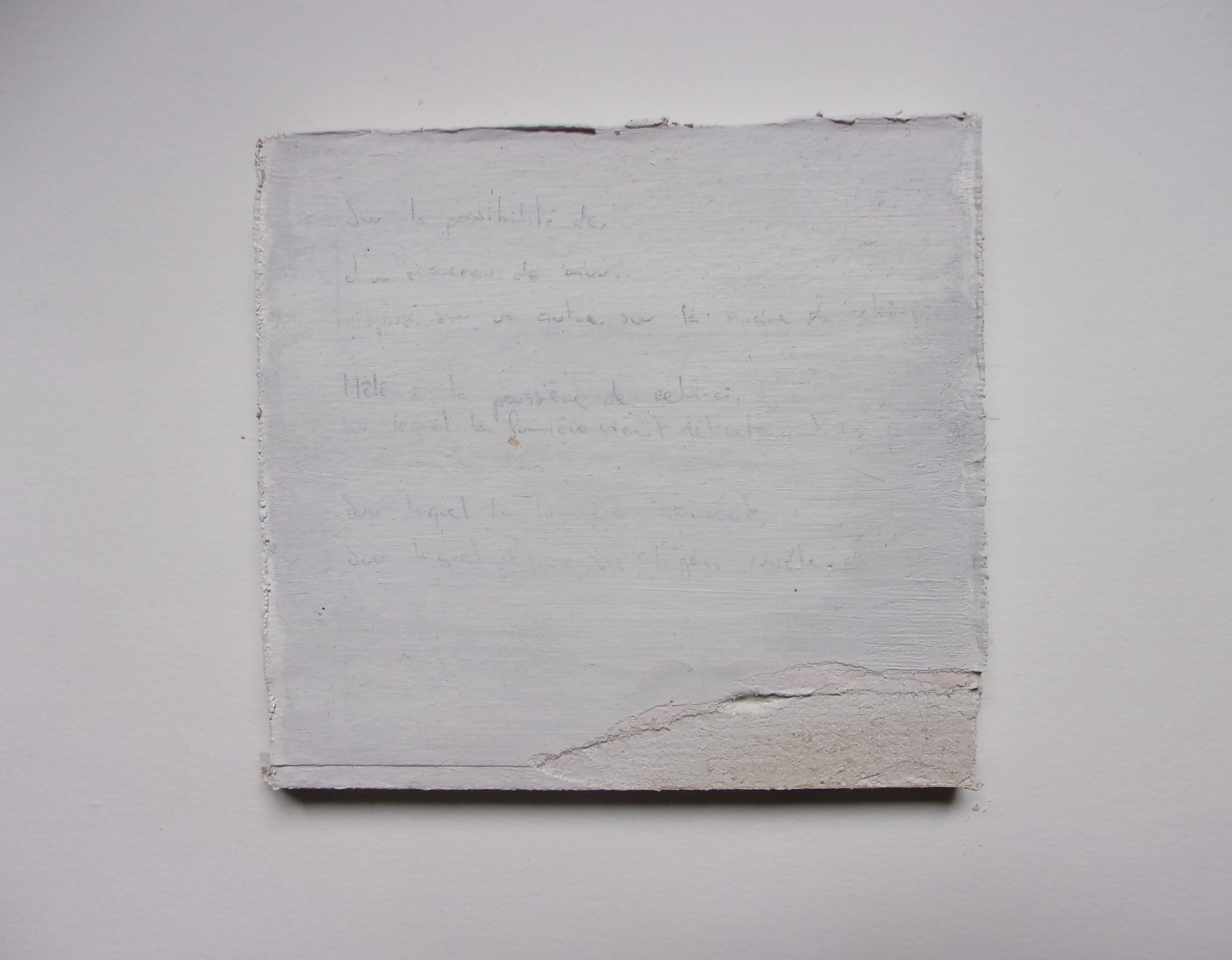 Détail : Quatre morceaux de placo peints en blancs de 12,4 x 11,5 x 1,3 cm et un morceau de 12,4 x 2,8 x 1,3 cm.