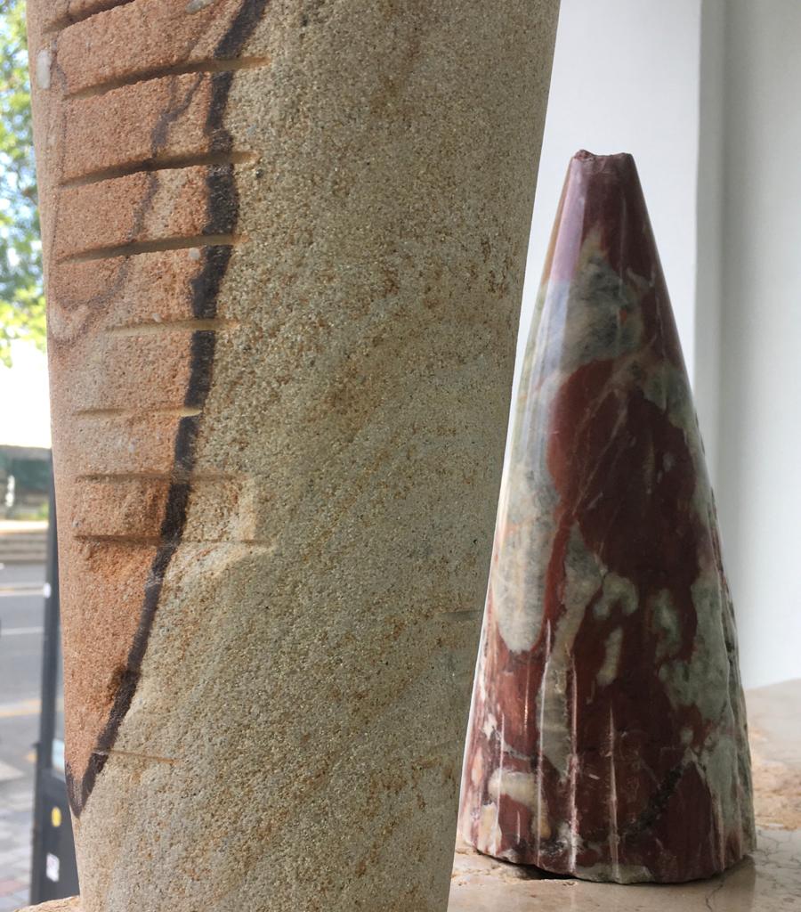 Chloé Pechoultres, fille de la nature sur terre et mer, a tissé un lien profond avec son matériau de prédilection. En sculpteur, elle a compris que : « la nature traite d’égal à égal avec l’art du sculpteur. Il n’obtient les fruits sublimés de ses pouvoirs qu’après s’être tardivement rendu maitre du cœur invisible de la pierre... »[2] Pour parfaire son geste, elle a suivi un stage chez une tailleuse de pierres : « Il suffit de creuser un peu la pierre pour se rendre compte qu’elle est autre chose que dure. »[3] Ainsi choisir des pierres brutes dans des espaces sauvages ou des carrières réputées ont-ils fait partie de sa démarche artistique. Ses excursions sont également liées à un certain gout pour une nature retrouvée, ce que le XVIIIe célébra avec des intentions plurielles chez Diderot et tant d’autres. Loin de s’investir dans une figuration réaliste, comme dans la tradition minimaliste, elle adjoint les unes aux autres des matières, des couleurs, des textures dans des recherches formelles. Mais dans ses constructions on décèle son admiration pour des sculpteurs qui l’ont marqué – le premier Giacometti des années trente tout comme Brancusi – pour les onyx d’Algérie employés au XIXe siècle par Charles Cordier qui rénova « la couleur dans la sculpture ». Car, chez elle se manifeste une grande sensibilité dans l’association des polychromies naturelles des noirs, des verts, des terres grumeleuses, aux blancs polis en contrepoint des variations formelles de ses œuvres.[...]”